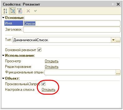 Создадим форму списка справочника Номенклатура и откроем палитру свойств основного реквизита формы Список. Установим флаг ПроизвольныйЗапрос и в строке Настройка списка нажмем Открыть.