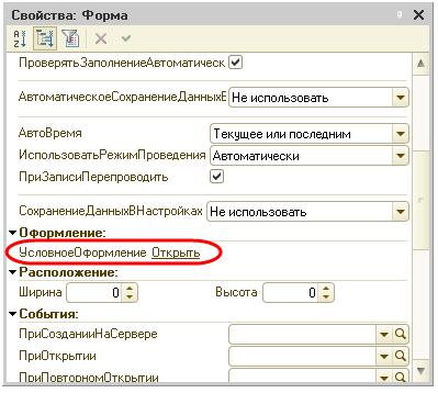 Выполним условное оформление интерактивно. Создадим форму документа ПриходнаяНакладная, выделим корень элементов формы (строку Форма) и откроем ее свойства. В строке УсловноеОформление нажмем ссылку Открыть.