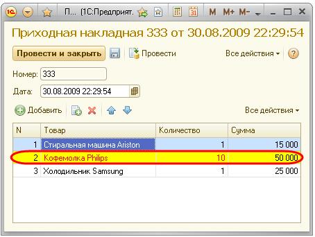 Например, нам требуется оформить строки табличной части приходной накладной так, чтобы строки с суммой больше 30000 были выделены желтым фоном, а ячейки Товар и Количество строк табличной части с количеством больше единицы были выделены красным текстом.